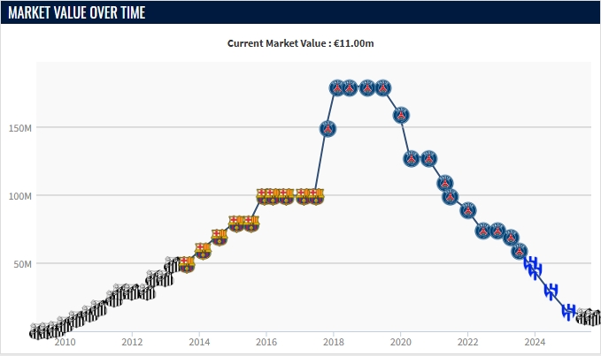 内马尔33岁身价现状↓